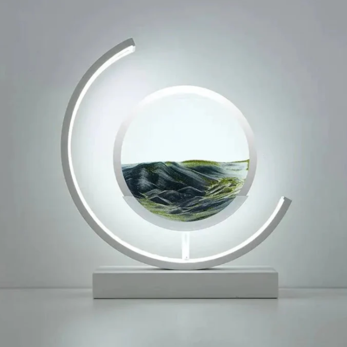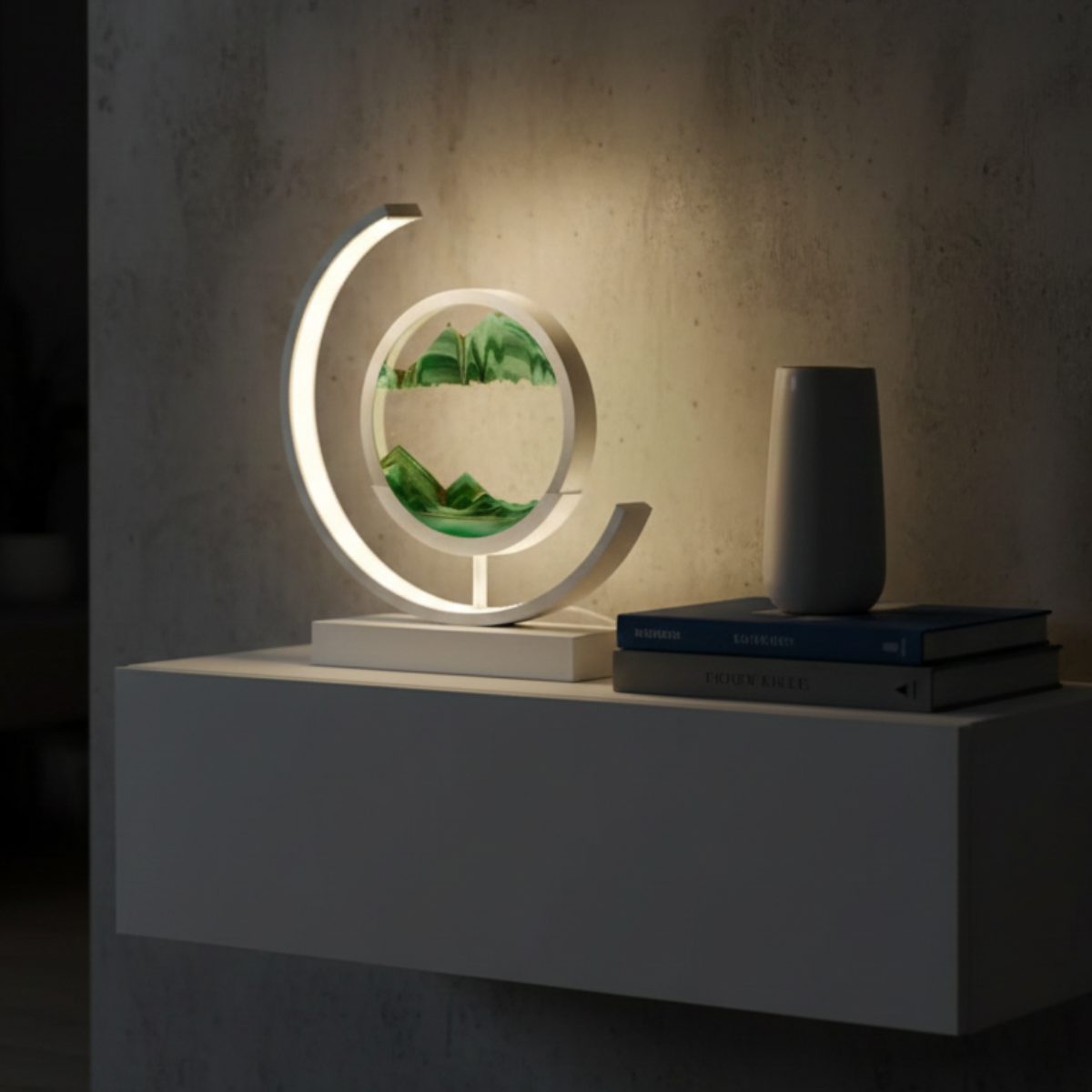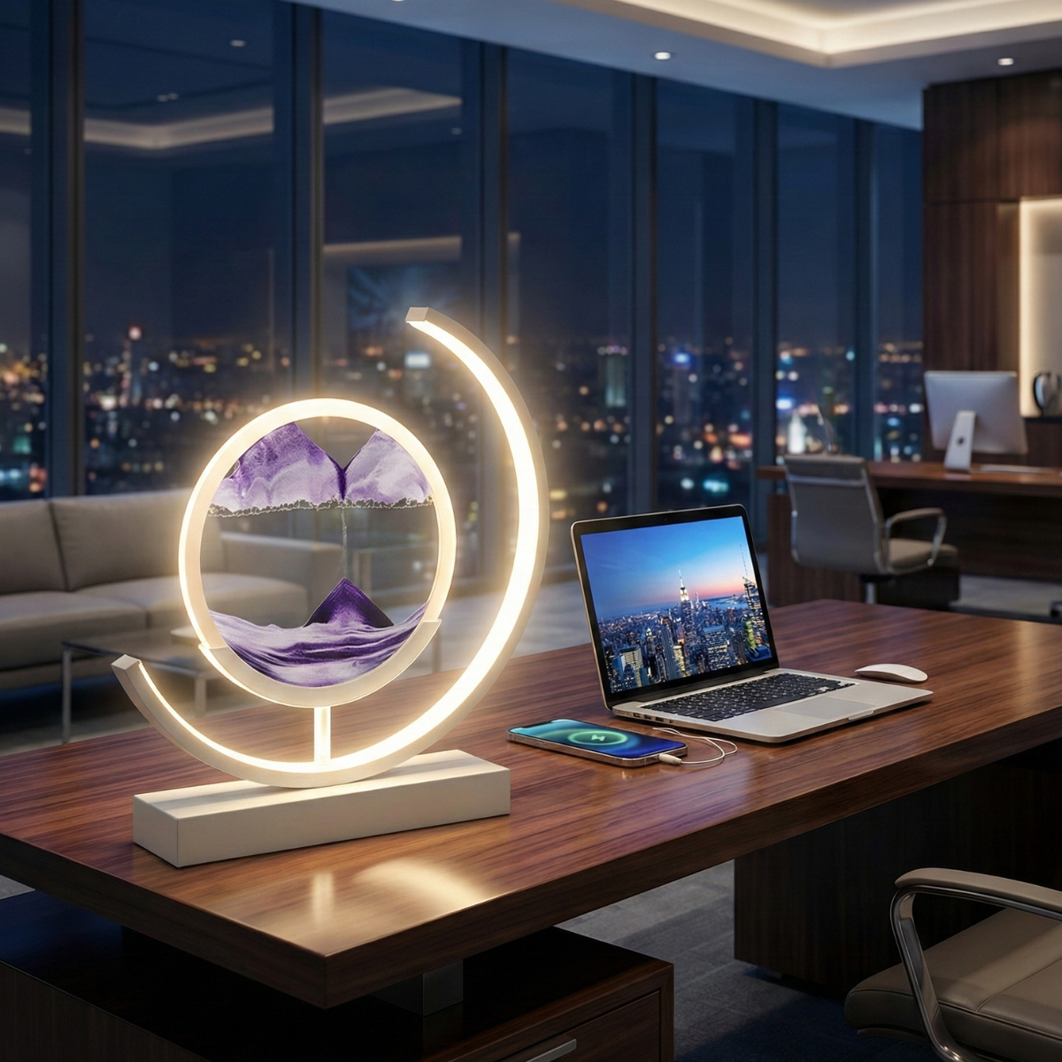 L'équilibre parfait entre lumière céleste et technologie invisible. Plus qu'une simple lampe, l'arche de sérénité est un objet hybride conçu pour les intérieurs exigeants. Elle met en scène une sculpture cinétique suspendue dans un croissant lumineux, tout en intégrant une base de recharge par induction pour votre téléphone. Une pièce magistrale qui transforme votre table de chevet ou votre bureau en un sanctuaire de clarté.