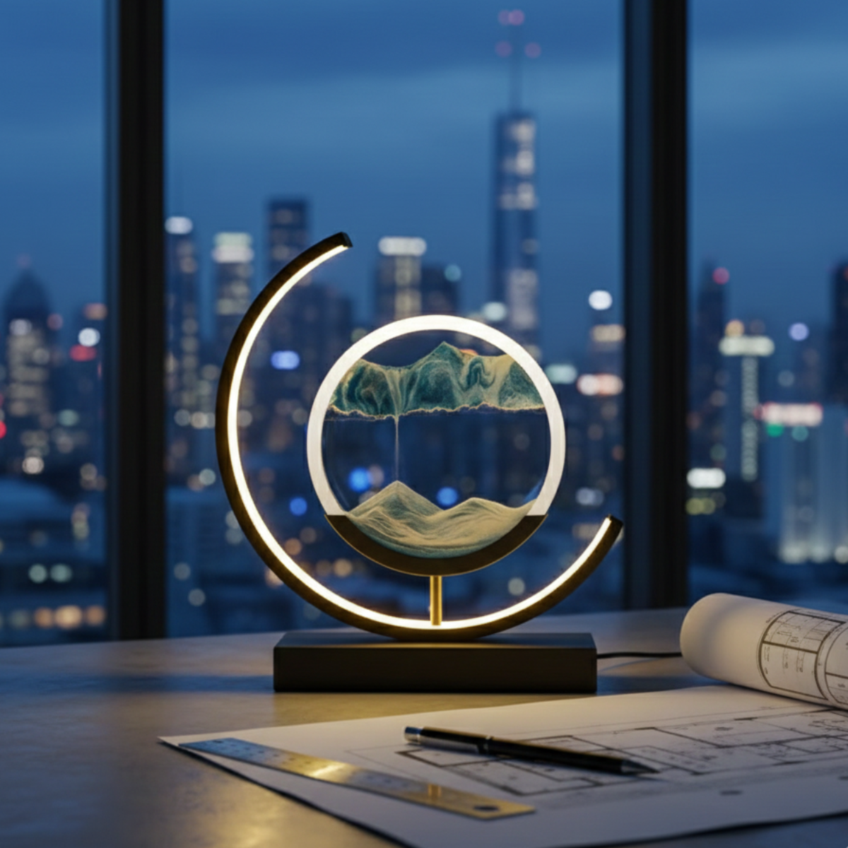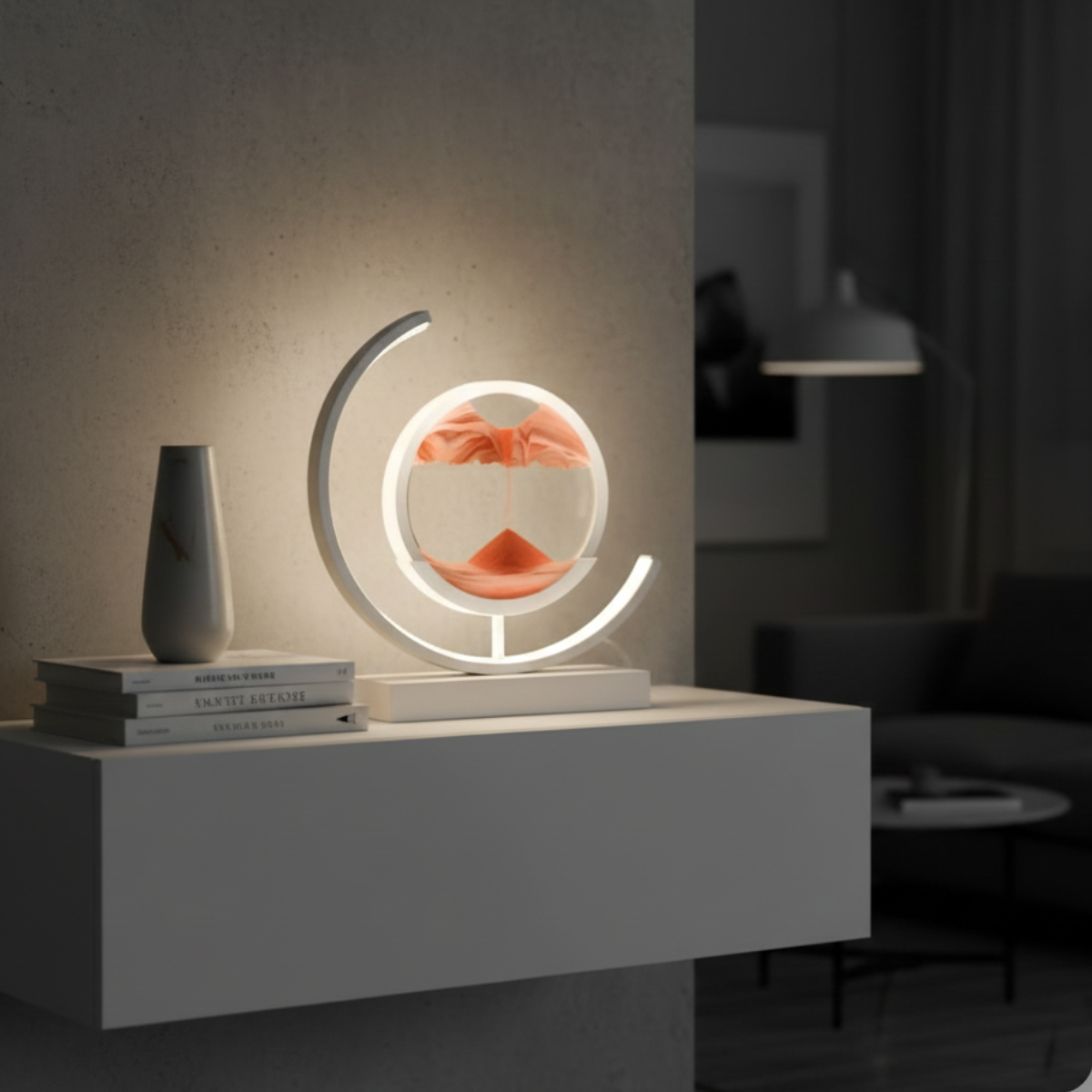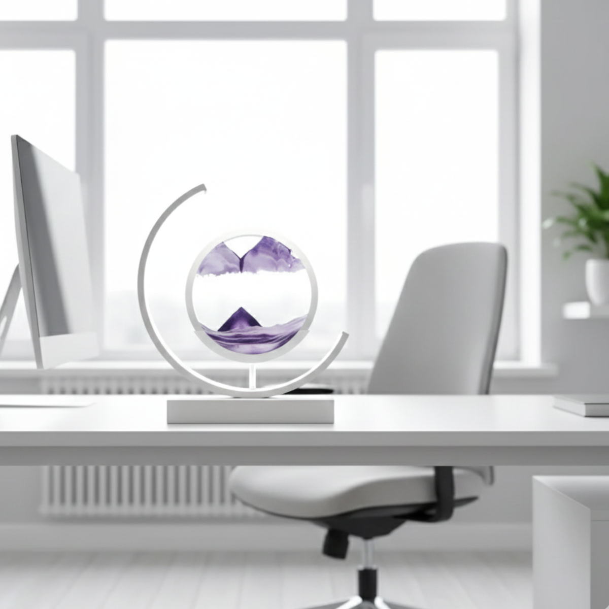 Chaque pièce invite à une immersion dans la sérénité. À travers le verre minéral, le sable s'écoule avec une régularité presque méditative, dessinant des silhouettes éphémères qui ne se répéteront jamais. C’est une sculpture cinétique où le temps devient une matière tangible, sculptée par la gravité et la lumière.