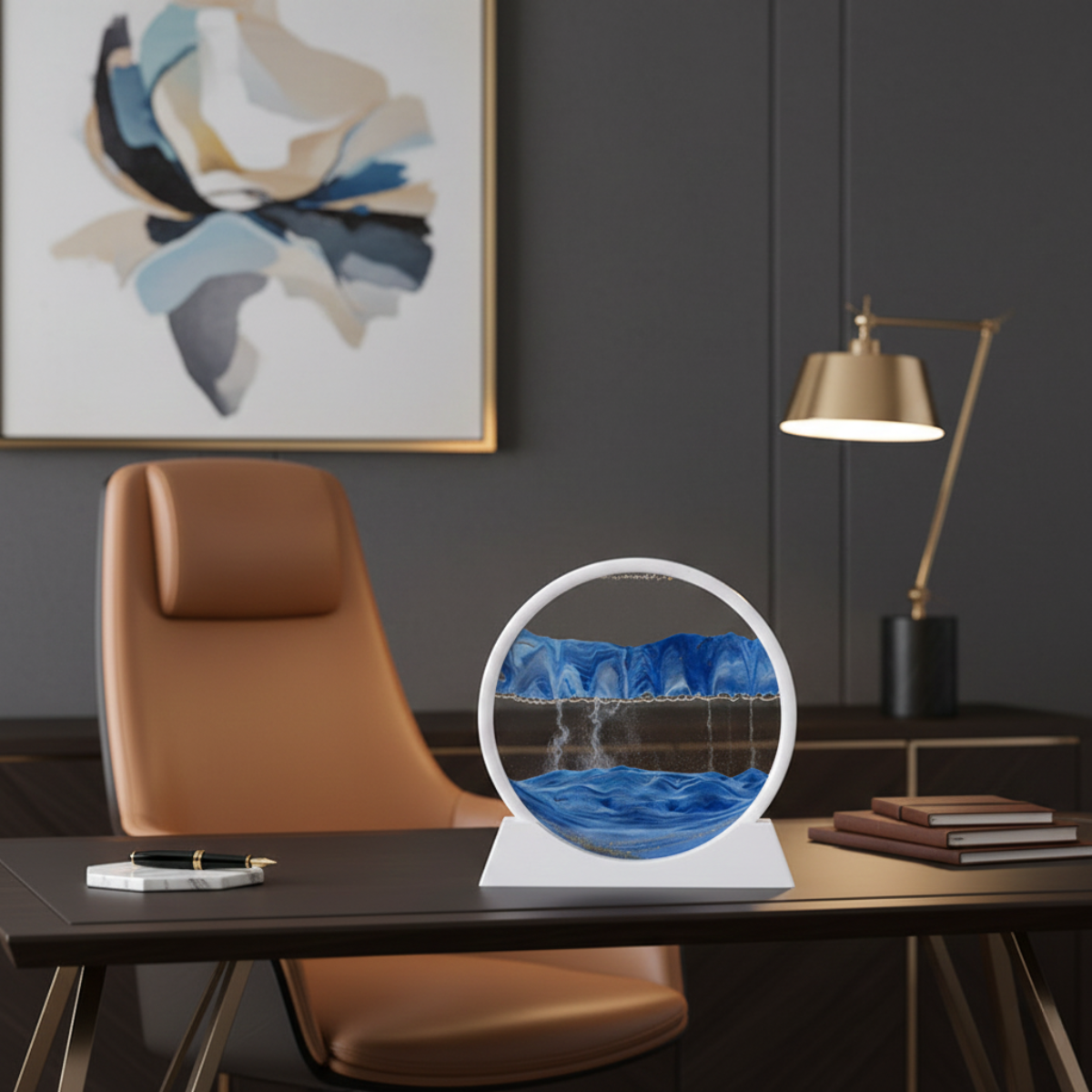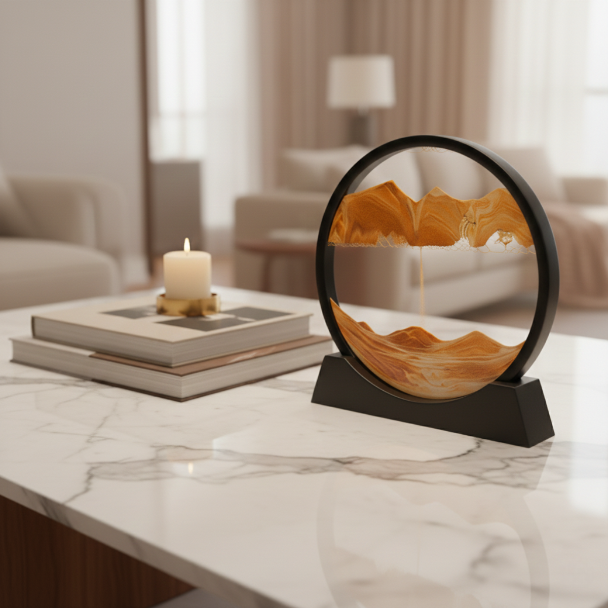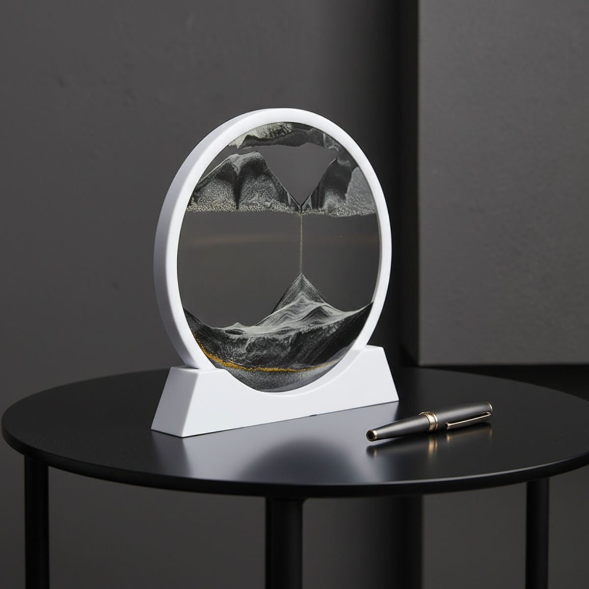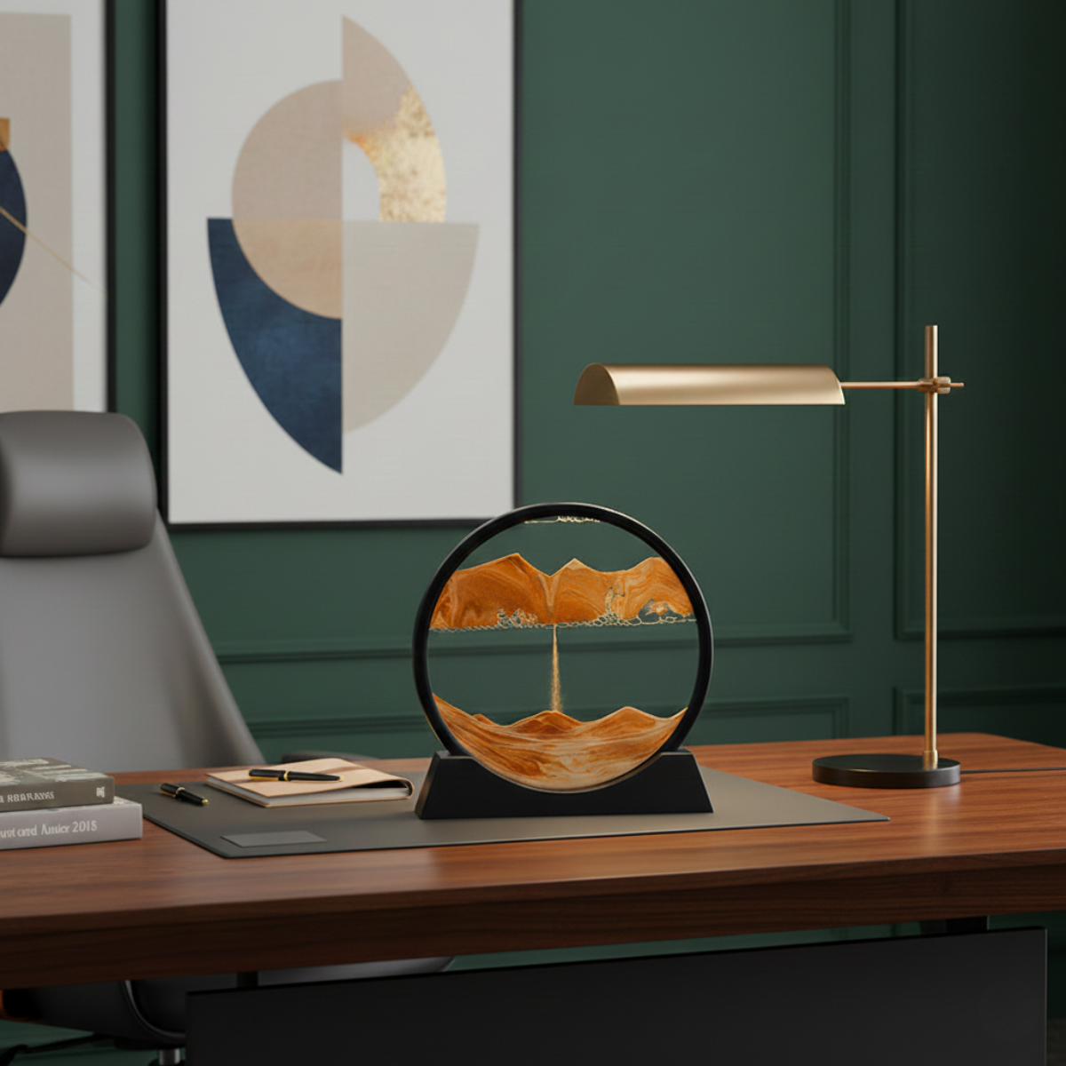 Chaque pièce invite à une immersion dans la sérénité. À travers le verre minéral, le sable s'écoule avec une régularité presque méditative, dessinant des silhouettes éphémères qui ne se répéteront jamais. C’est une sculpture cinétique où le temps devient une matière tangible, sculptée par la gravité et la lumière.
