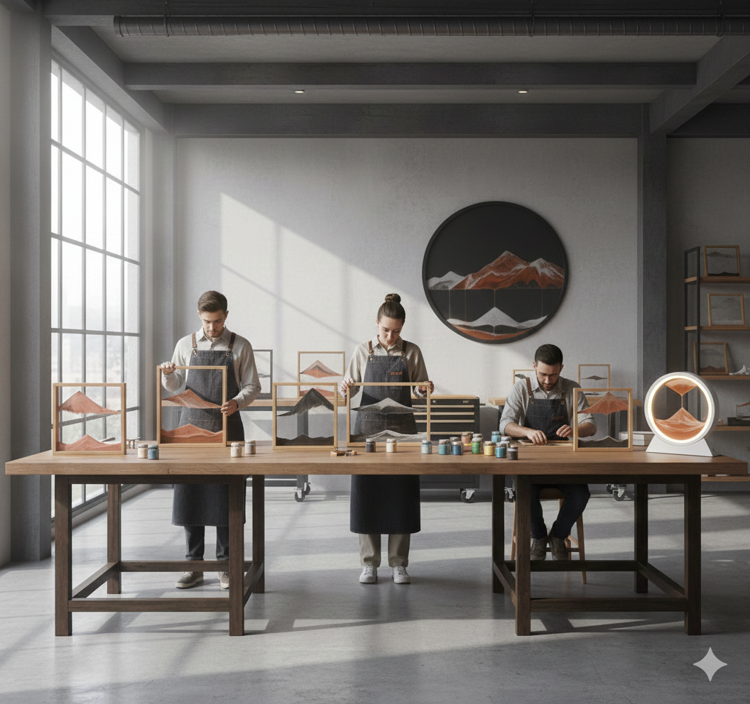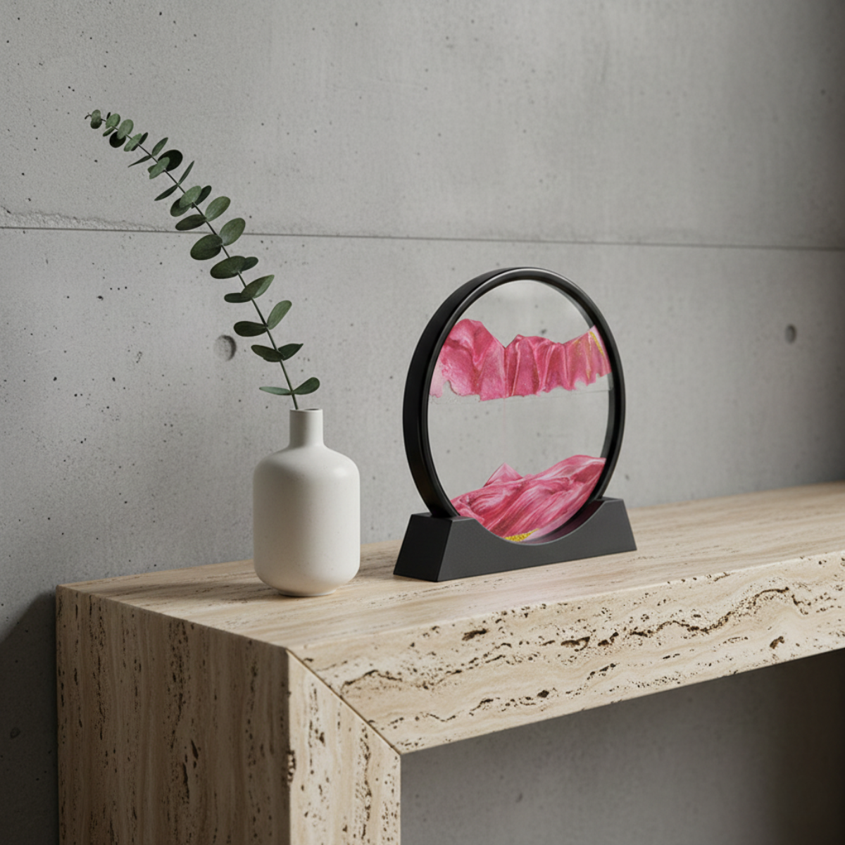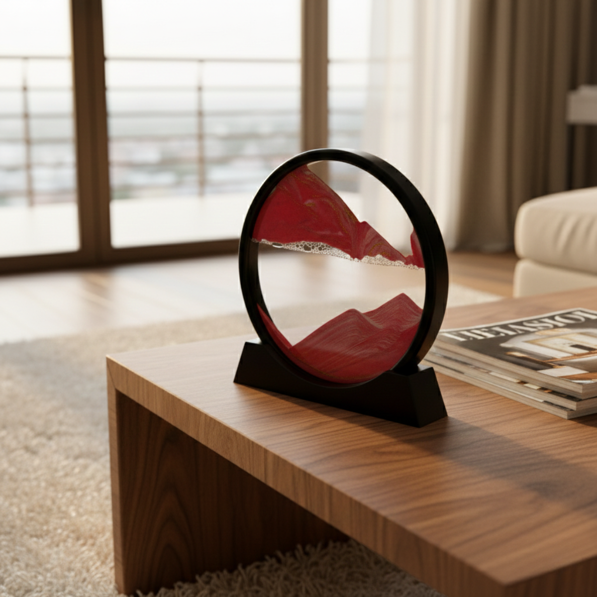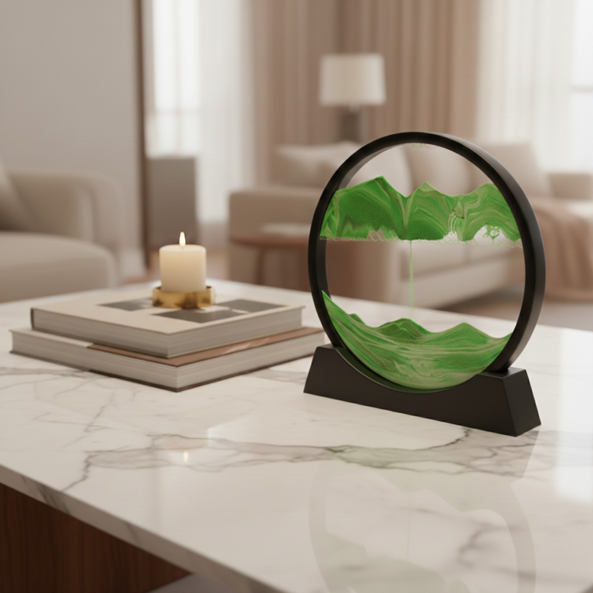 Chaque pièce invite à une immersion dans la sérénité. À travers le verre minéral, le sable s'écoule avec une régularité presque méditative, dessinant des silhouettes éphémères qui ne se répéteront jamais. C’est une sculpture cinétique où le temps devient une matière tangible, sculptée par la gravité et la lumière.