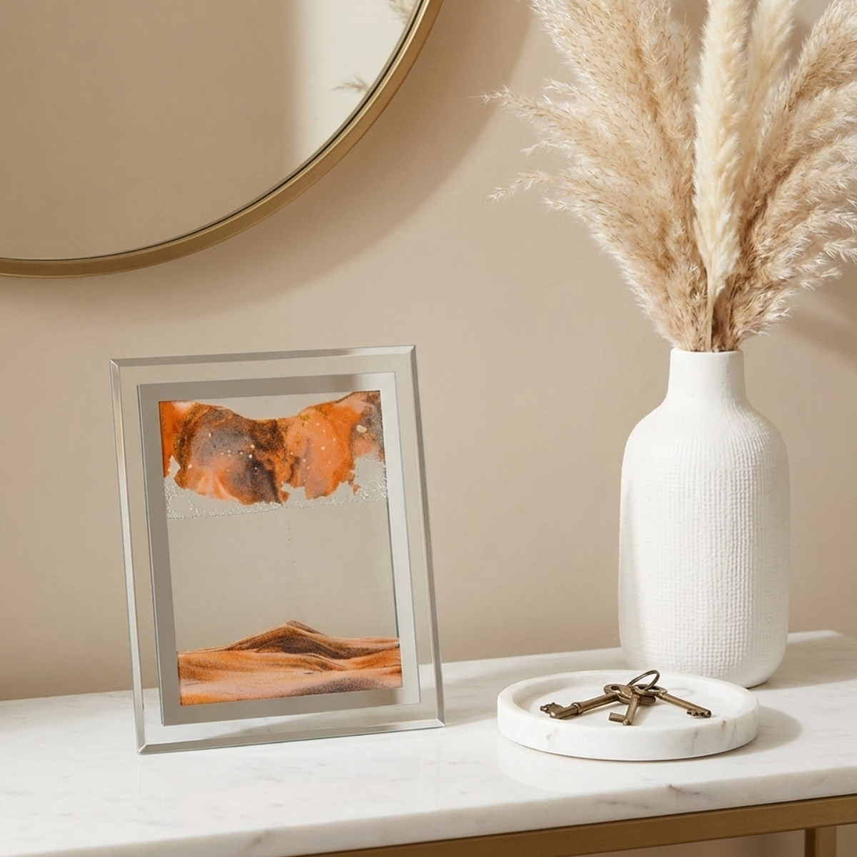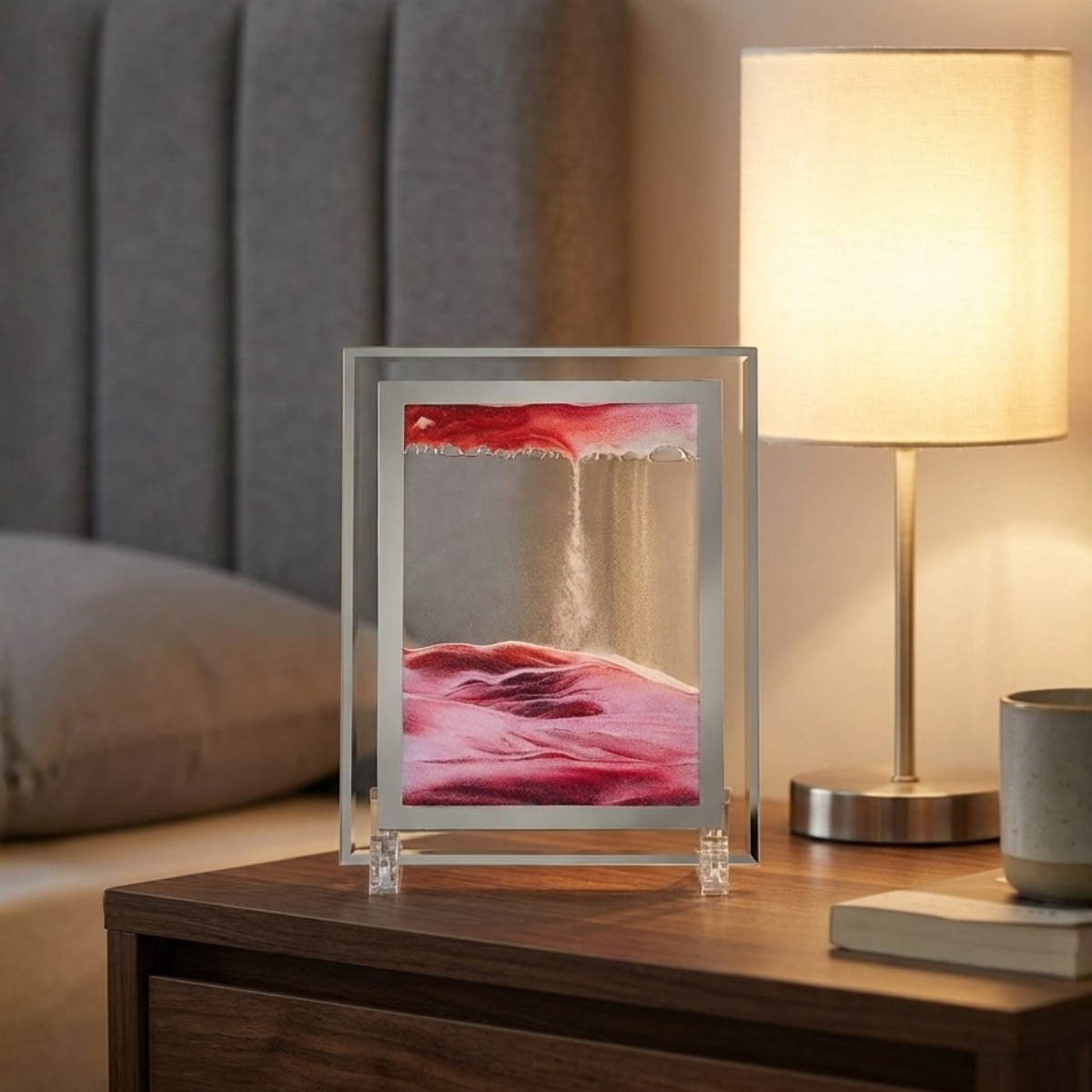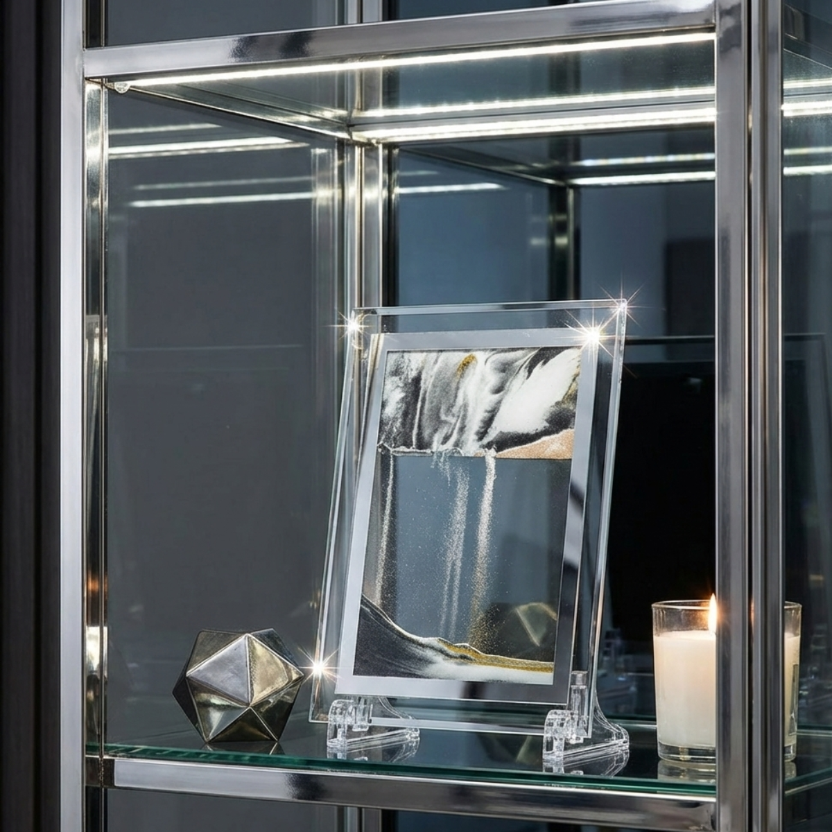 Chaque pièce invite à une immersion dans la sérénité. À travers le verre minéral, le sable s'écoule avec une régularité presque méditative, dessinant des silhouettes éphémères qui ne se répéteront jamais. C’est une sculpture cinétique où le temps devient une matière tangible, sculptée par la gravité et la lumière.