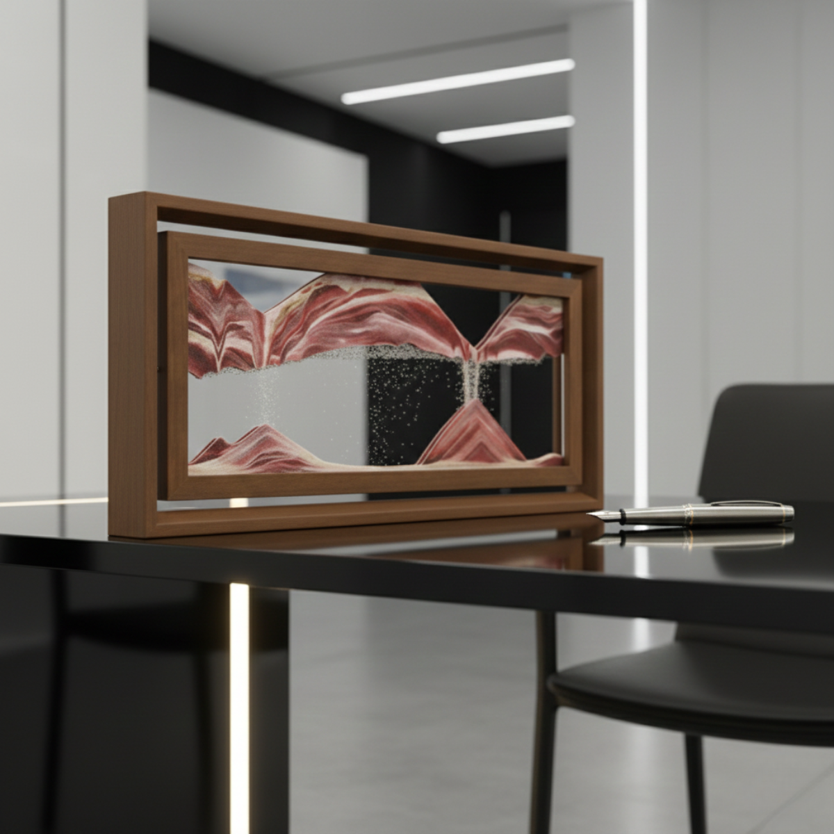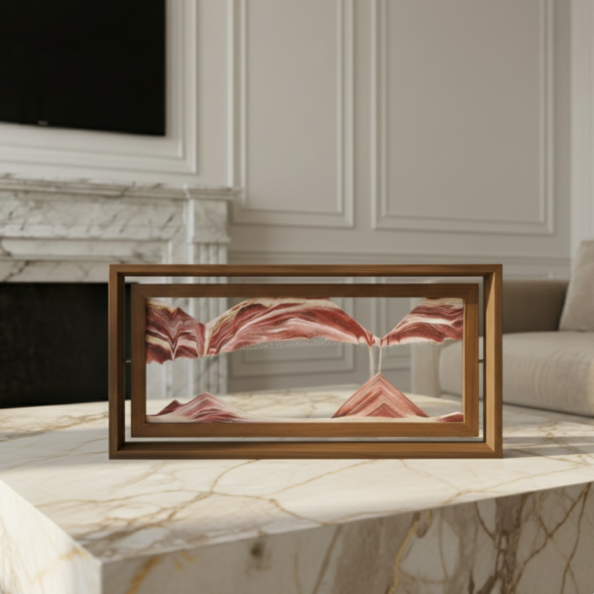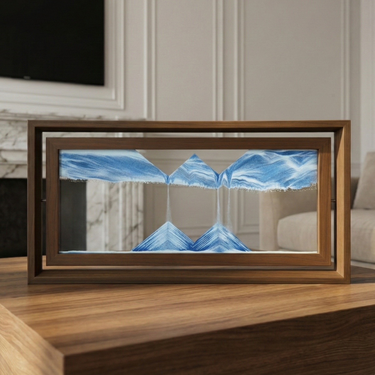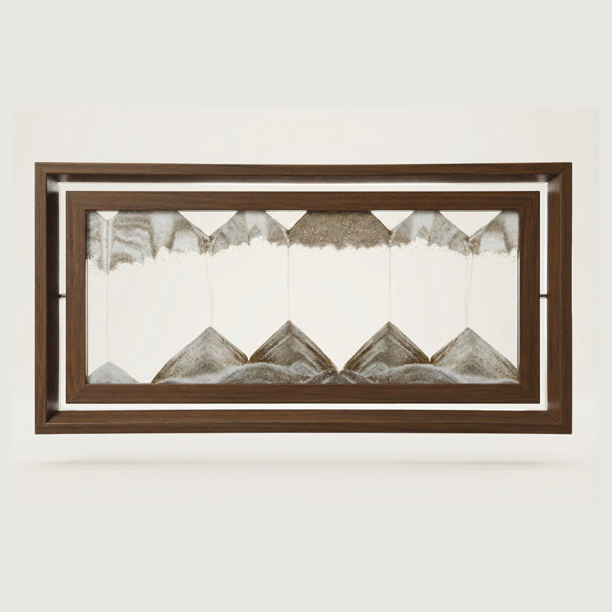 Chaque pièce invite à une immersion dans la sérénité. À travers le verre minéral, le sable s'écoule avec une régularité presque méditative, dessinant des silhouettes éphémères qui ne se répéteront jamais. C’est une sculpture cinétique où le temps devient une matière tangible, sculptée par la gravité et la lumière.